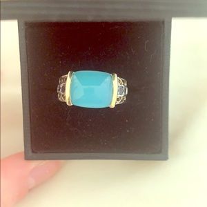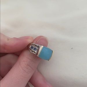 Gorgeous blue stone ring with gorgeous details on the side. Very solid ring.
