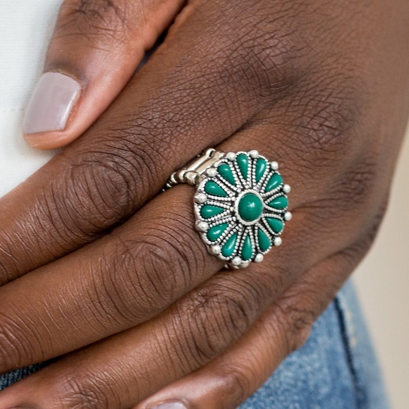 Ring size 5 - 10. Has stretchy back. Very comfortable.