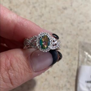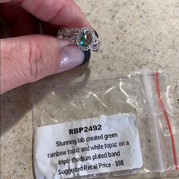 Stunning lab created green rainbow topaz and white topaz on a triple rhodium band.