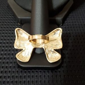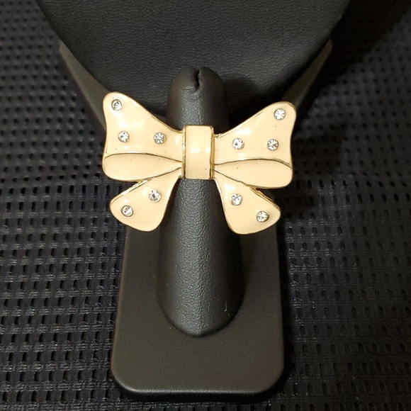 Beige Enamel with Sparkling Diamond-like Stones adorn this Pretty Bow, Gold-toned Ring.