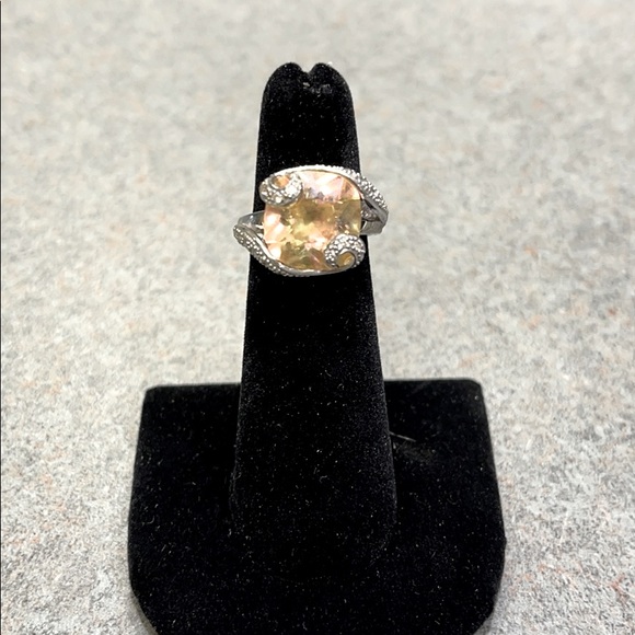 Silver ring with a pink/yellow gemstone. Crystal details on the ring. Size 5.5. Worn few times but good condition