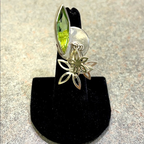 Green stone ring with flower detail hanging. Adjustable back but right now it’s a size 5. Sterling silver. Worn once
