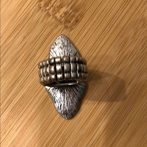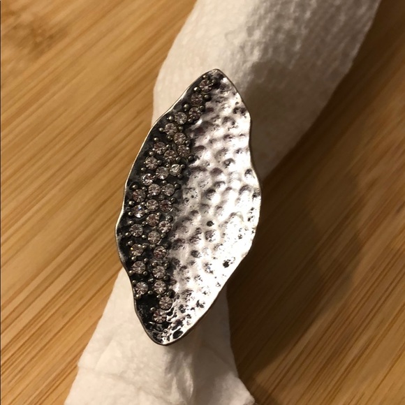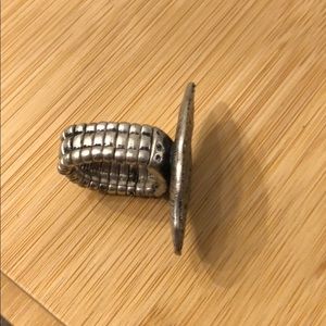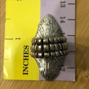 Silver color, costume ring with small sparkle detail. Band is “stretchy”. I’m not sure of the size but it fits more securely on my middle finger.