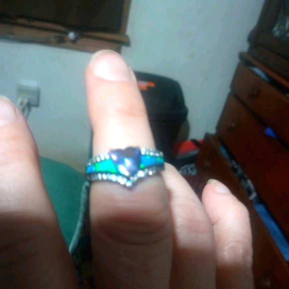 Purple heart cz's stone in middle with green/blue sparkle on each side trimmed with small cz stones