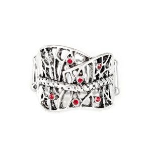 Dainty red rhinestones are sprinkled along a shattered silver frame, creating an edgy centerpiece atop the finger. Features a stretchy band for a flexible fit.