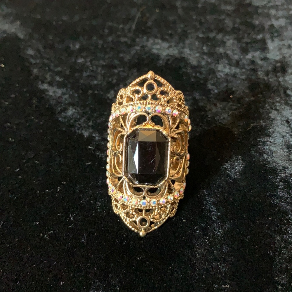 Vintage style gold tone ring with a large black stone in the middle and clear stones around.