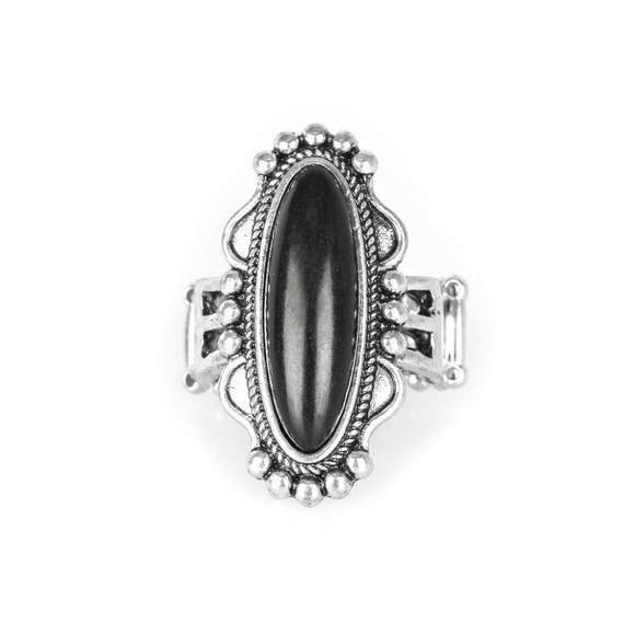 Silver stretch band ring with a black stone in the center. Fits women size 6-10. Nickel and lead free.