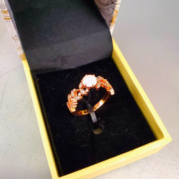 18K Rose Gold Plated White Fire Opal & Cubic Zirconia Fashion Ring, Size 8
