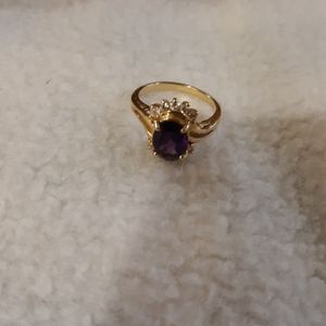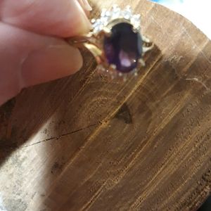 Stunning yellow gold amethyst ring, like new, this truly is a beauty. Total of 10 diamonds that surround a substantial oval cut deep amethyst stone. There are four prongs holding this stone. Uniquely designed. Dont blink. Woohoo.
