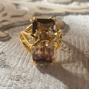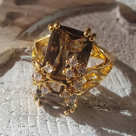 size 9 gold tone costume ring with huge (3/4" x 1/3") smokey quartz stone and 8 round rhinestones