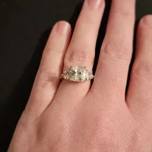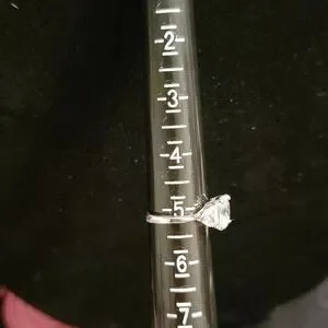 Three stone cubic zirconia ring. the center stone is a square while the side ones are heart/triangles. Their cuts allow for maximum sparkle and will go with any outfit to add a little pop! I ordered a size 5 & that's what I received. It fit correctly, even though the measuring tool says it's closer to 5 1/4. Center stone measures at 1/4 inch.