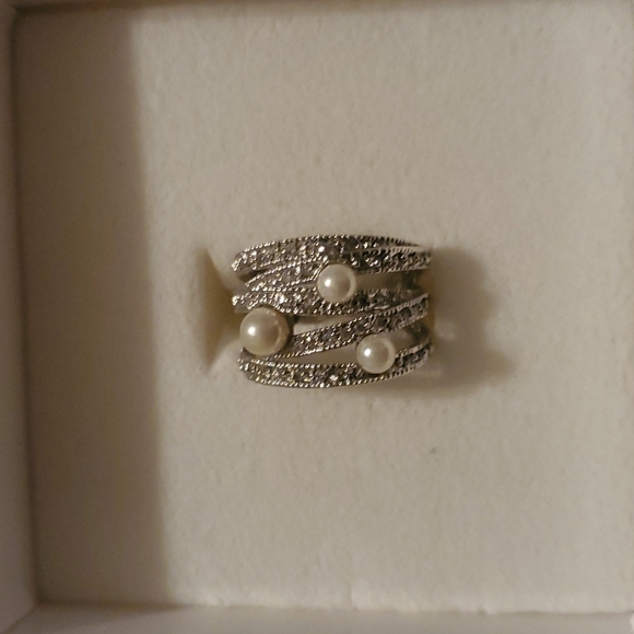 premier designs silver ring with crystals and pearls. size 6 I believe