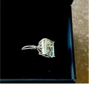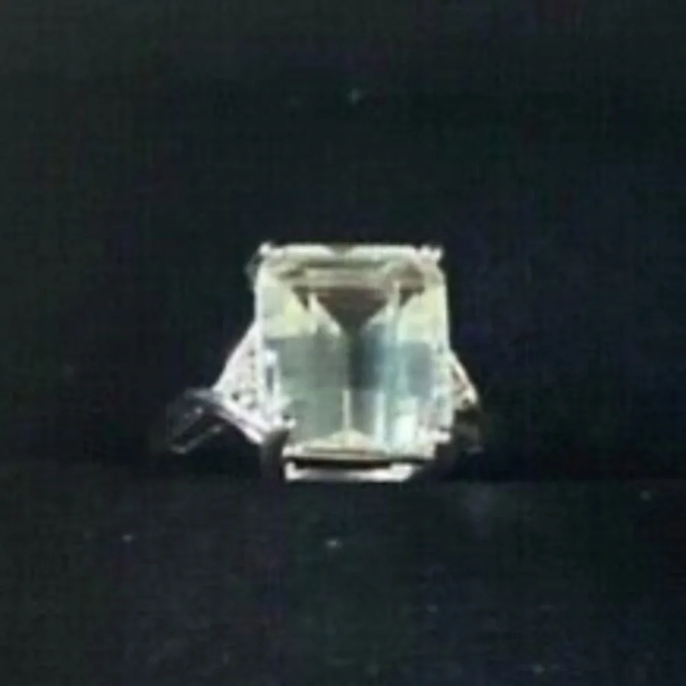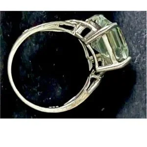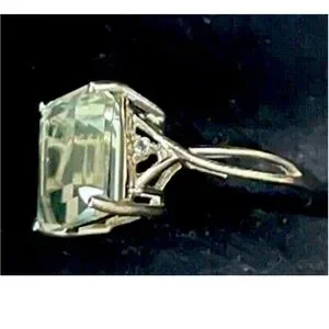 Green quartz emerald cut center stone with accent white topaz stones sterling silver size 7 excellent condition.