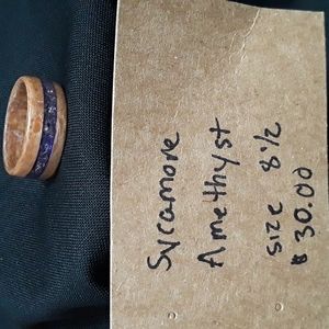 Handmade ring. Made of Sycamore wood with genuine Amethyst center. Size 8 1/2. Slightly darker wood tone than in picture. Brand new, never worn.