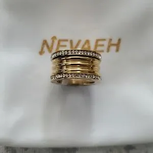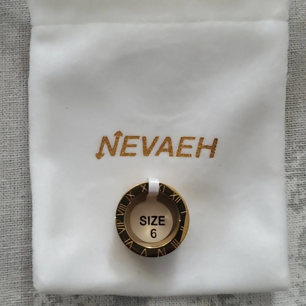 Fashionable ring, gold colored, grooved with raised crystals and Roman Numerals all around on both sides. Does not comfortably on my finger, just not in my best financial interest to return to company in the UK.. Check company website for more in depth product details.