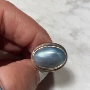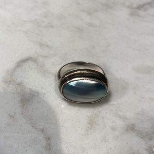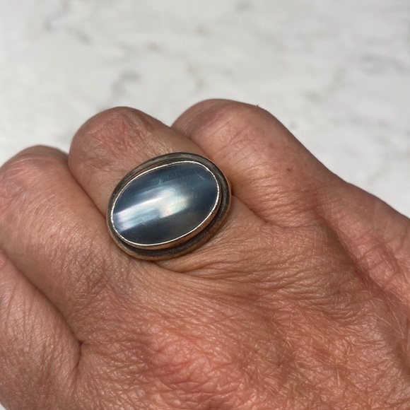 Great ring in silver with grey stone and or shell. I loved this ring but need to get rid of some things and haven’t worn in some time. Ready for someone else to enjoy