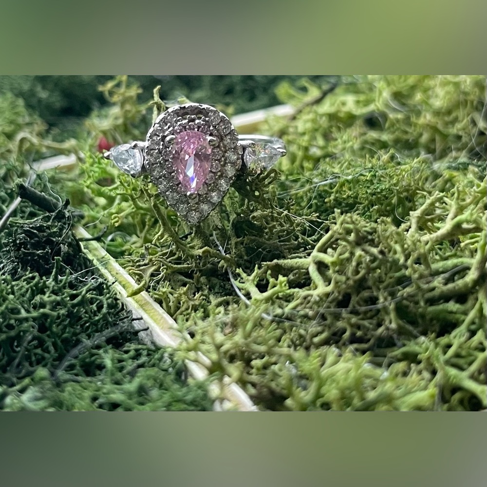 Pear cut fashion ring with pink stone. It is missing two smaller gems as shown in pictures.