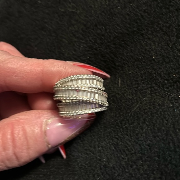 Womens cocktail ring with 3 rows of lab created baguette diamonds, exquisite ring for the price Sterling silver set in platinum size 9