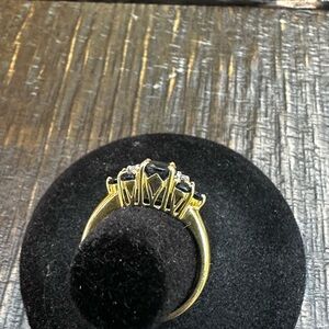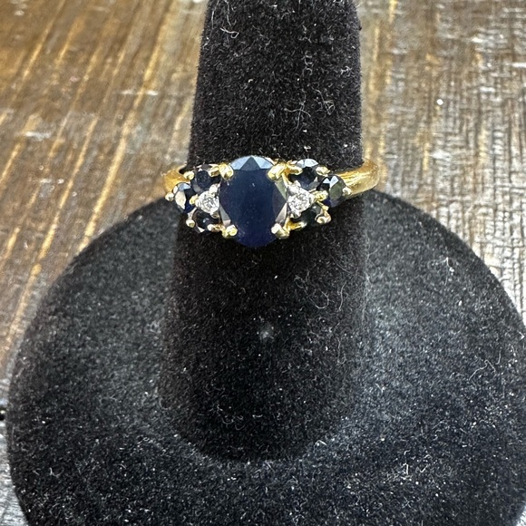 This sapphire and diamond ring is set in a 14K gold setting with one prominent sapphire, a diamond on each side along with three smaller sapphires.
