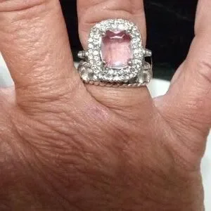 This ring is a size 6, It is a pink stone,with silver ring mount. It's absolutely gorgeous. I tried to take a pick with it on my finger, but then my hands were looking a tad rough! Overlook the hands I'm in the garden.