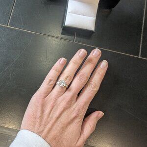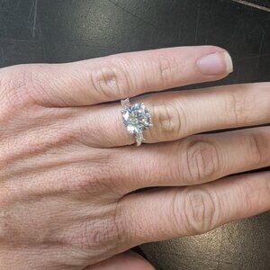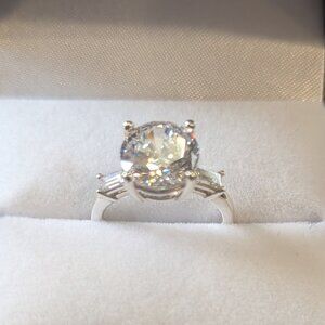 Size 4 engagement ring. Smaller diamonds are lab grown and gem in the center is CZ. The setting and stones were customized at Prestige Jewelers in Hiram GA. Brand new never worn.