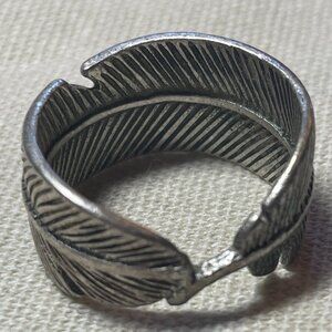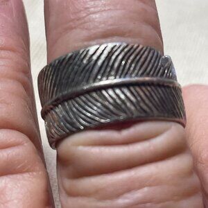 This ring is called Haven by Parklane. The design is a feather wrapped around the finger. with a little nitch in the feather. If you like to wear rings on the thumb or index finger this one works great. This ring was used only for display and is a size 8. I have another listing with the very same ring in gold. Willing to negotiate. Make me an offer on one or both.