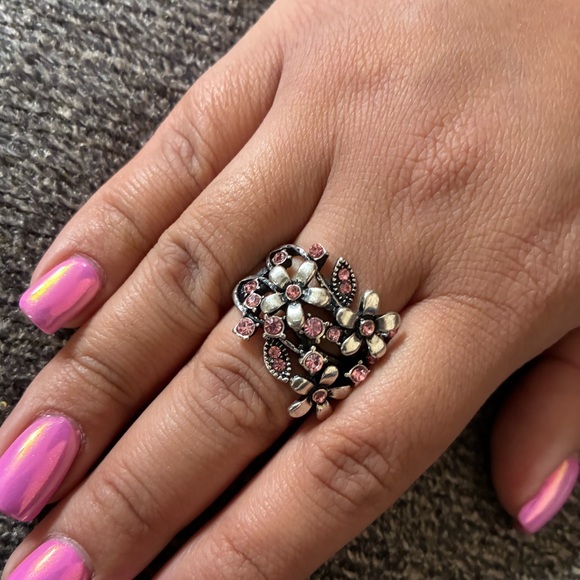 Accessorize Your Beauty with these Silver Flowers and Pink Rhinestones on a Thick Back Silver Stretch Band. Fits Sizes 5-10. Lead and Nickel Free.