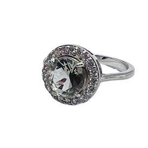 Gray gemstone (lab created) surrounded with CZ looking accents a silver color band, (rhodium plated)