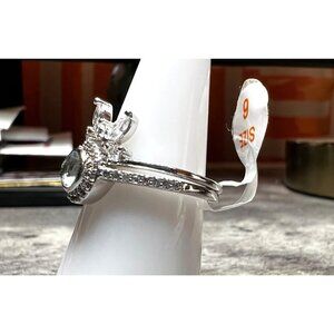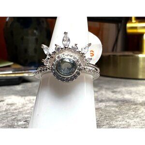 Gray blue gemstone (lab created) surrounded with CZ looking accents like a crown over main stone on a silver color band, (rhodium plated)