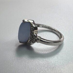Light blue gemstone on a silver color band, (rhodium plated) surrounded with CZ looking accents