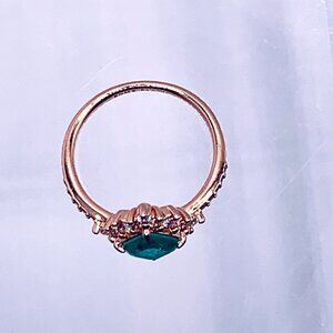 Beautiful princess cut lab created emerald gem surrounded by tiny simulated white topaz gems on a gold plated band. Size 8.5. New without tags.