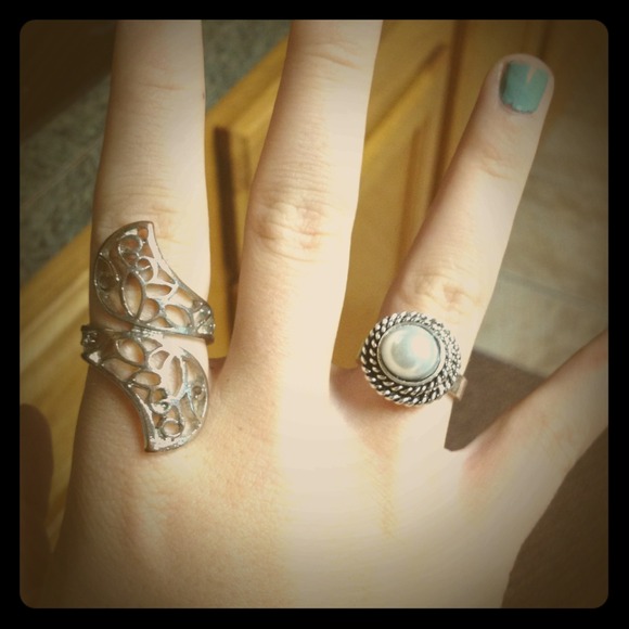 One silver ring that has a "swirl" design, and a pearl ring with a silver rope accent surrounding (not real).