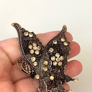 A very unique oversized butterfly ring is in an antique bronze tone with rhinestones.