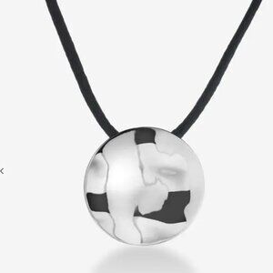 This Ring Concierge necklace features a hammered pendant in sterling silver. The pendant diameter is 32 mm and is removable from the satin cord necklace. The necklace length is adjustable from 15-16 inches and has a lobster clasp closure.