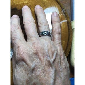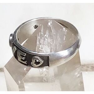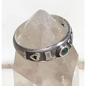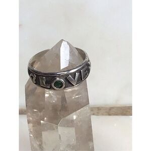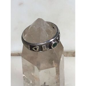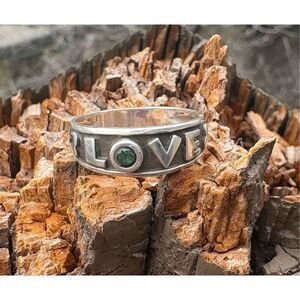 Gorgeous little sterling silver band ring has LOVE set into the band. There is a see-through heart on each side of LOVE. Rather than an “O”, there is a tube setting with a faceted green Colombian Emerald set into it.