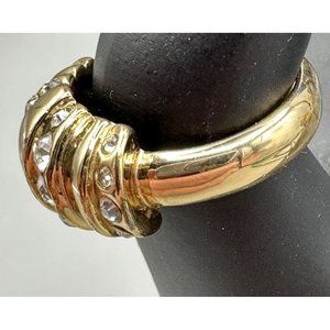 Cocktail type ring with strips of gold and glass stones.The glass stones are pronged and the band shows signs of wear. The gold plating is starting to wear off if you look closely. Other than the wear, the stones are all there and in very good condition. The band is about 1/8th inch and the length of the main part of the ring is .5 inches.The ring has been cleaned