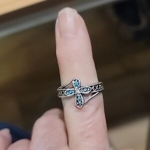 size 9 women's ring , new in package. inscribed inside with : with God all things are possible. light blue gemstone cross shape with etched sides