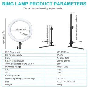 Ring light inner diameter is 23.9cm/9.4inch, outer diameter is 30.5cm/12inch.