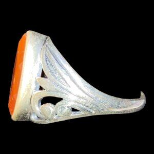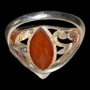 This vintage sterling silver ring is a size 8.5, adorned with a marquise cut carnelian. The stone, measuring 17mm x 8mm, displays a beautiful blend of red and orange hues, perfect for women who appreciate vintage style.