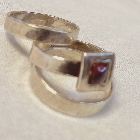 Stacked ring set, hammered silver, artisan’s stamp, garnet stone. Size slightly under7 1/4.