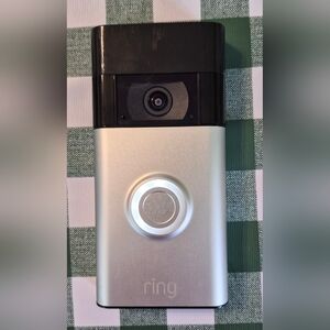 Sleek Ring video doorbell. Features black and silver colors. Enhances home security.