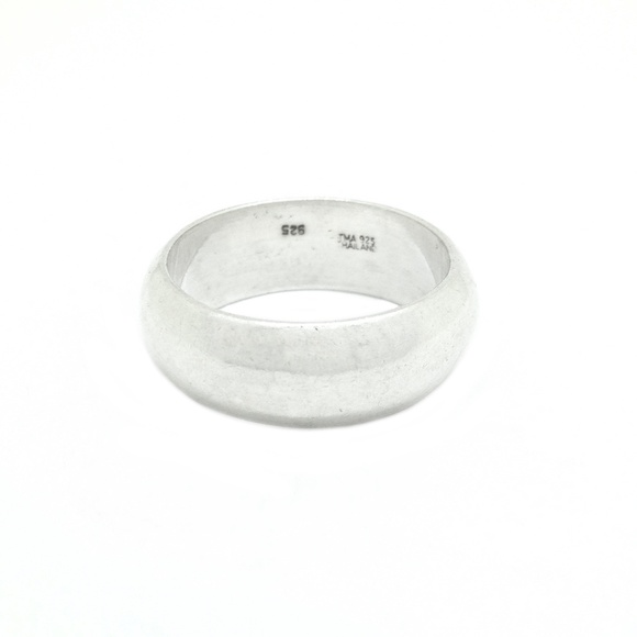 Band is 7mm tall, 2mm thick with curved surface. Stamped '925' with maker's mark. Weight 2.2 grams.