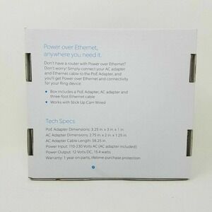 Enable Power over Ethernet for your Stick Up Cam Wired with the Ring PoE Adapter. Simply connect your AC adapter and ethernet cable to the PoE Adapter and run an ethernet cable to your Stick Up Cam Wired for Power over Ethernet.