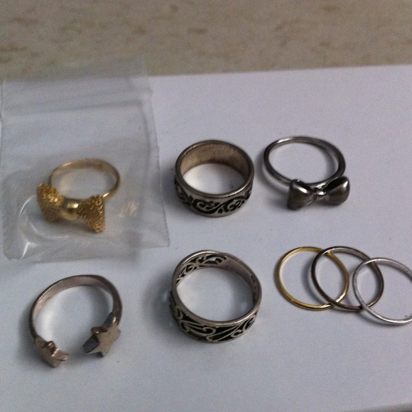 2 on left are adjustable. 2 in the middle are size 5. Top right bow is size 7. 3 rings are size 3 (knuckle rings)