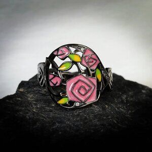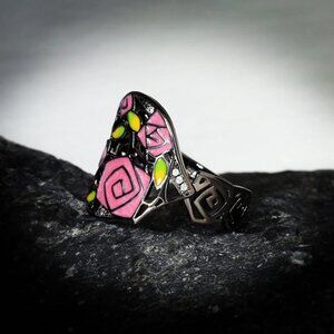 Brand new ring made out of black plated sterling silver. The top design with roses is 3/4" x 3/4" large. The roses are finished with colored enamel and the stones are clear cubic zirconias. The ring weighs 4 grams.