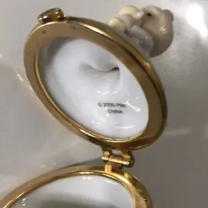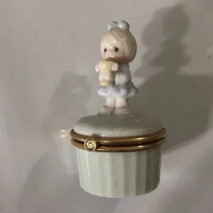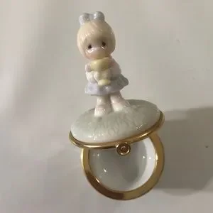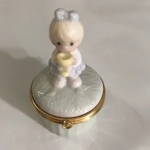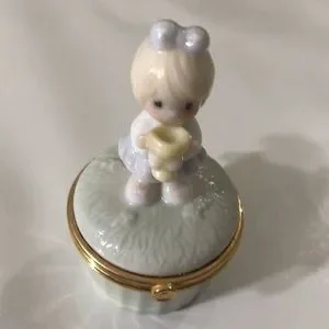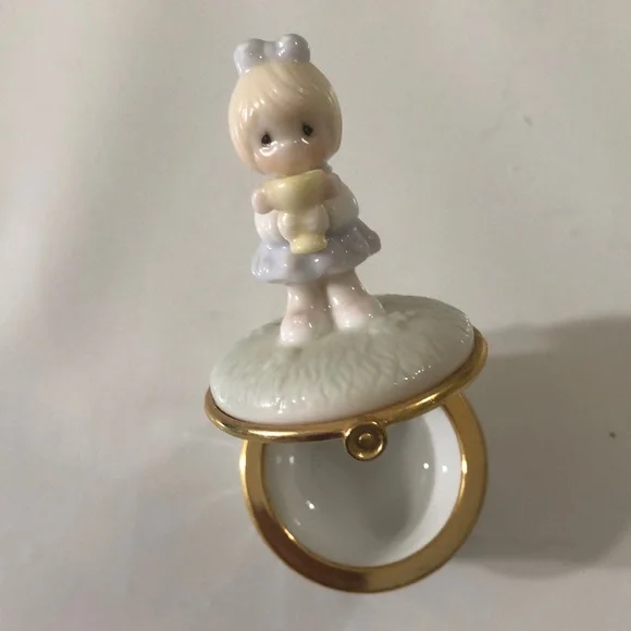 Rare find, 23 years old, ring, safe keeper, precious moments. Used to keep engagement and wedding rings . beautiful piece. White soft colors with gold trim, porcelain glass. It is. 3 inches tall and 2 inches wide. Makes a great collectible / Christmas gift. Has small markings on back of cover. See picture. Porcelain glass.