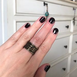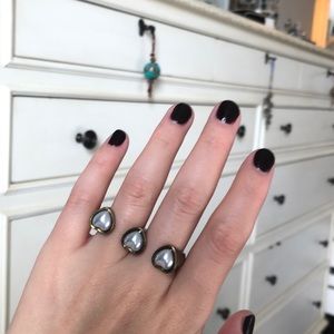 As pictured. The turquoise ring is probably 7-7.5. Multicolor stone ring is around 5.5, bronze engraved ring about 5.5. Double ring adjustable. Estimated based on my size and may not be accurate.