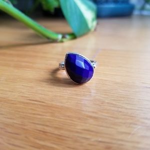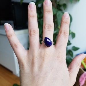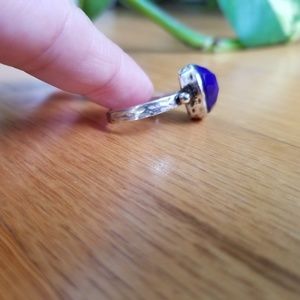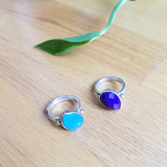 The gemstones are most likely man-made and one is a more translucent turquoise color while the other mimics the color of a lapis stone. The metal is a silver color with a beautiful hammered looking design. Offers welcome!
