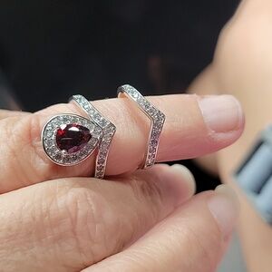 Beautiful ring set with red center stone surrounded by diamonds as well as a diamond band. I make no guarantees if the stones are real or man made.