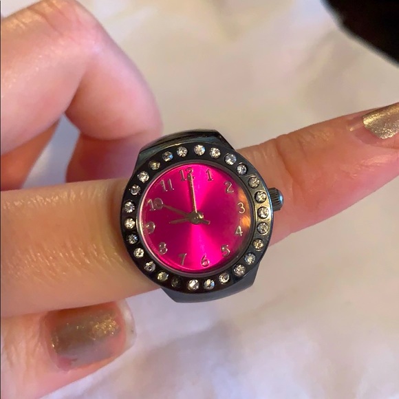 A watch for your finger. From Claire’s. Black band with fake diamonds and pink clock face. Band stretches to fit multiple sizes. Fits ring sizes 6-7 comfortably. Missing one diamond on the front. Needs new watch battery